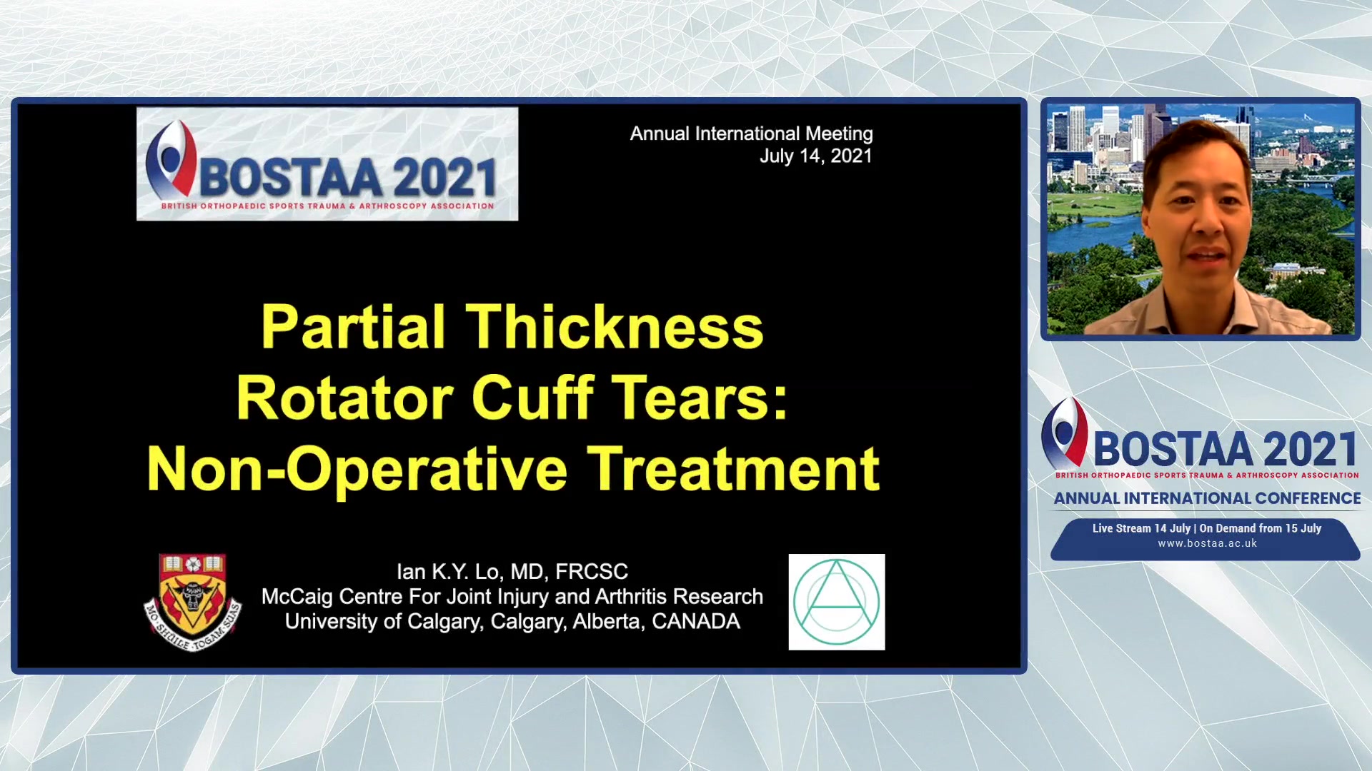 In this presentation, Ian Lo discusses the prevalence and treatment options for partial thickness rotator cuff tears, particularly in athletes. He acknowledges the BOSTAA and program committee for their invitation to speak from Canada. Lo reveals that partial thickness tears are significantly more common than full thickness tears, with limited literature available on the former, especially in athletic contexts. He emphasizes that non-operative treatments, including physical therapy and home exercise programs, can be beneficial, successfully treating around 50% of cases, especially those with certain characteristics such as an atraumatic onset and a tear thickness of less than 50%. The presentation also reviews studies showing the long-term outcomes of patients treated non-operatively and discusses ongoing research regarding biological treatments like PRP and their potential benefits over traditional approaches. Lo highlights that while most patients show improvement, the factors influencing success rates and tear progression are critical for determining the appropriate management path for individuals.