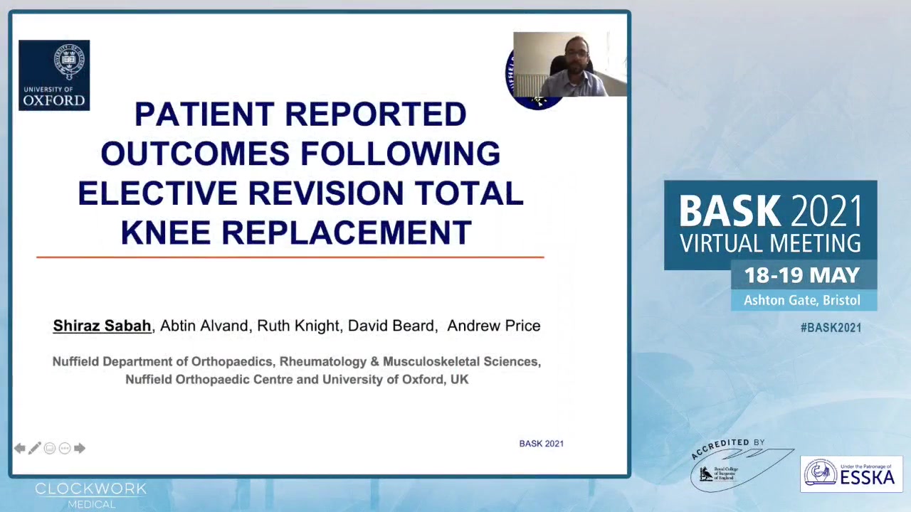This presentation features Shiraz Sabah, an orthopedic registrar and PhD candidate from Oxford, who discusses Patient Reported Outcome Measures (PROMs) following elective revision knee replacement surgery. He expresses gratitude for the opportunity to present at the BASK conference and acknowledges his co-authors' contributions. Shiraz highlights the importance of evaluating surgical outcomes from the patients' perspectives and notes the UK's decade-long implementation of PROMs for both hip and knee replacements.