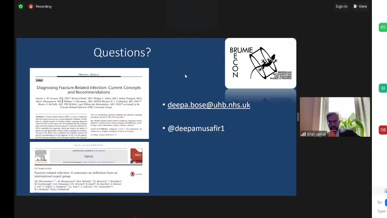 In this informative webinar hosted by Bilal Jamal, experts discuss the complexities of managing musculoskeletal infections, with a focus on polymicrobial infections related to fractures. Bilal introduces the Bone and Joint Infection Society, highlighting their multidisciplinary approach and collaboration with the Bone and Joint Infection Registry. Subsequently, Neil Ritchie, an infectious disease physician from the Queen Elizabeth University Hospital in Glasgow, takes the stage. He emphasizes the high prevalence of polymicrobial infections in fracture-related cases, outlining the challenges these infections pose due to varying microbiological profiles and treatment options.