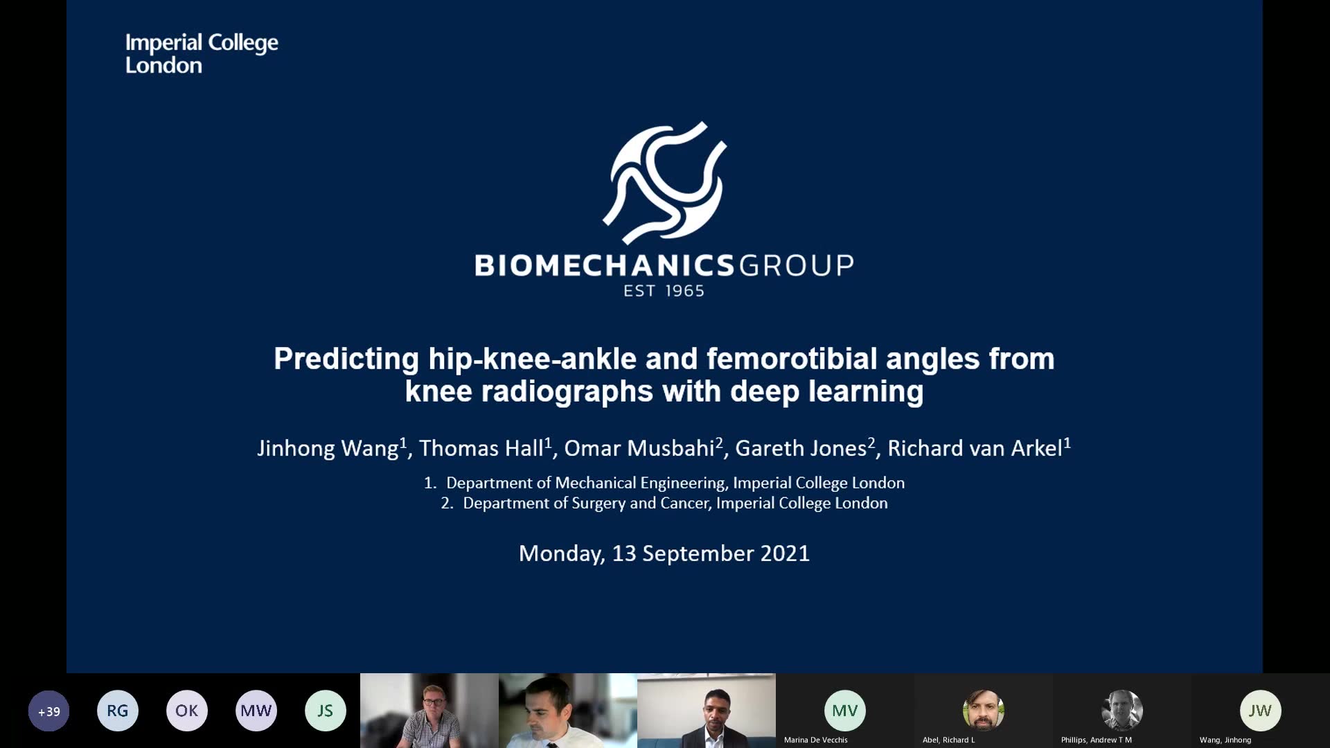 In this presentation, Jinhong Wang from Imperial College London explains a research project focusing on using deep learning techniques to predict knee alignment angles from knee radiographs. The study highlights the significance of knee alignment in diagnosing and treating osteoarthritis, emphasizing the difficulty and expense associated with traditional measurement methods like the Hip-Knee-Ankle angle (HKA) and the FemoroTibial Angle (FTA). The project employs convolutional neural networks to analyze plain radiographs, establishing separate models for FTA and HKA. Wang discusses the datasets used, the training process, and the accuracy of the predictions, showcasing the models' effectiveness via graphical representations and statistical analyses. The outcomes indicate a high level of accuracy in angle prediction, with 98.5% of FTA predictions and 83.9% of HKA predictions reflecting errors of less than 3 degrees. Wang also notes the potential for implementing this AI method in clinical settings due to its speed and cost-effectiveness, as well as the value of heat map analyses for evaluating prediction reliability. Questions from the audience address practical implementation, cost considerations, and the reasons for varying accuracy between the FTA and HKA measurements.