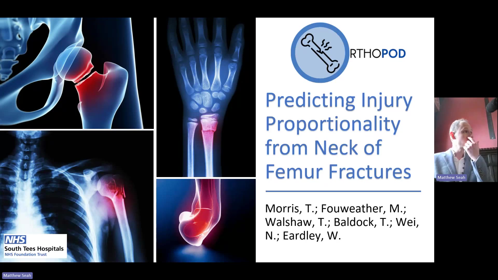 This presentation, led by Tom Walshaw, a postdoctoral research fellow at Cardiff University and orthopedic trainee from the Northern Deanery in England, focuses on a study titled "Predicting Injury Proportionality from Neck of Femur Fractures." The research is part of the broader Orthopod Project, a national multicenter prospective service evaluation of orthopedic trauma hospital outcomes, which compiled data from 23,000 patients across 90 hospitals in the UK.