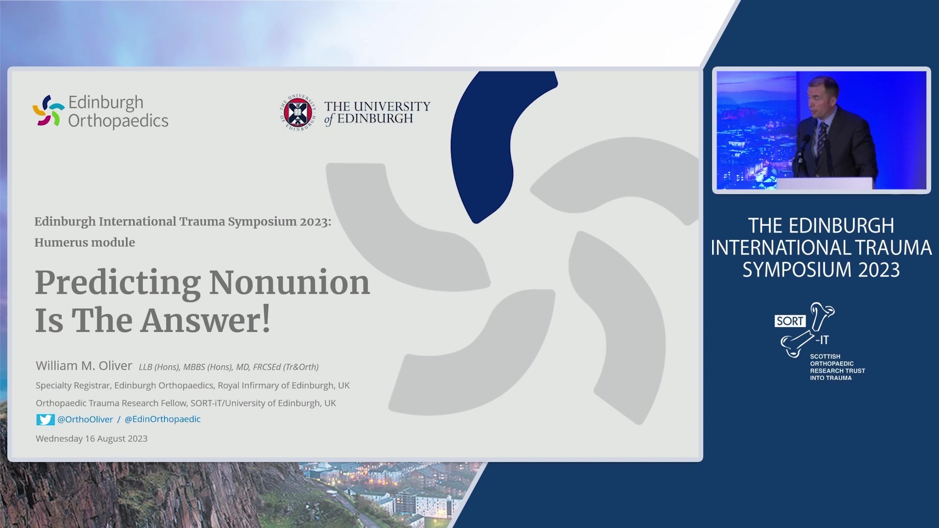This presentation, led by William Oliver, addresses the topic of non-union prediction specifically related to humeral shaft fractures. Oliver begins by discussing the default nonoperative management approach to isolated closed humeral shaft fractures, despite evidence showing a significant complication rate of non-union (around 20%). He highlights that while surgical intervention for non-union is effective, it often results in poorer medium to long-term outcomes compared to successful initial management.