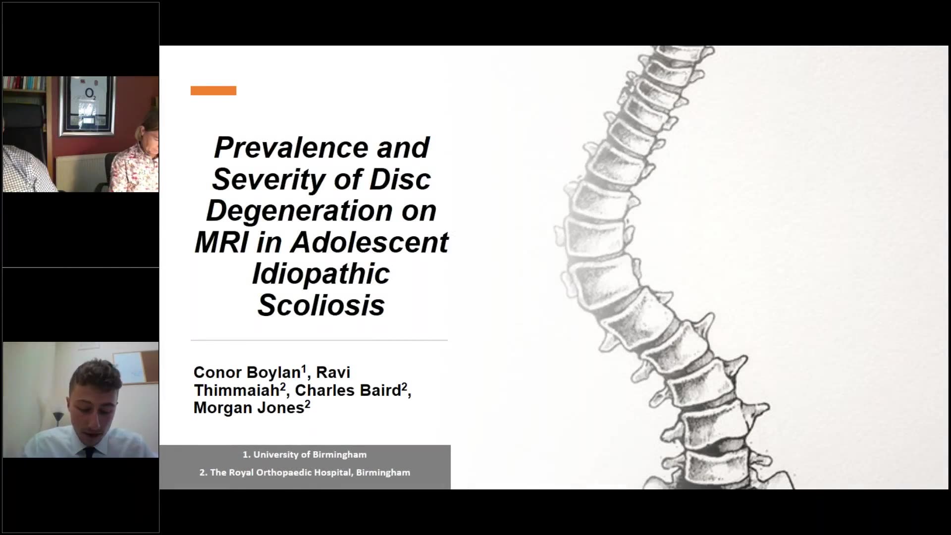 The video presentation features Conor Boylan, a final-year medical student from the University of Birmingham, discussing his research on disc degeneration within the context of adolescent idiopathic scoliosis (AIS). He begins by explaining the nature of scoliosis as a three-dimensional spinal deformity, emphasizing its prevalence among adolescents and its associated health complications such as back pain and psychosocial issues.