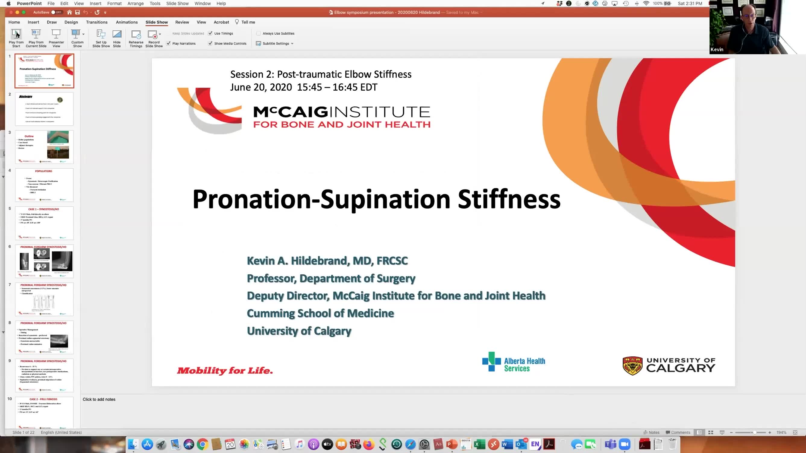 This presentation, delivered by Dr. Kevin Hildebrand, focuses on the complexities of elbow injuries, specifically addressing cases of proximal ulna synostosis and fibrosis of the proximal radioulnar joint. Dr. Hildebrand thanks the Canadian Shoulder and Elbow Society for the opportunity to present and states that he has no disclosures. The talk is primarily case-based, illustrating treatment approaches for elbow fractures and the associated surgical interventions.