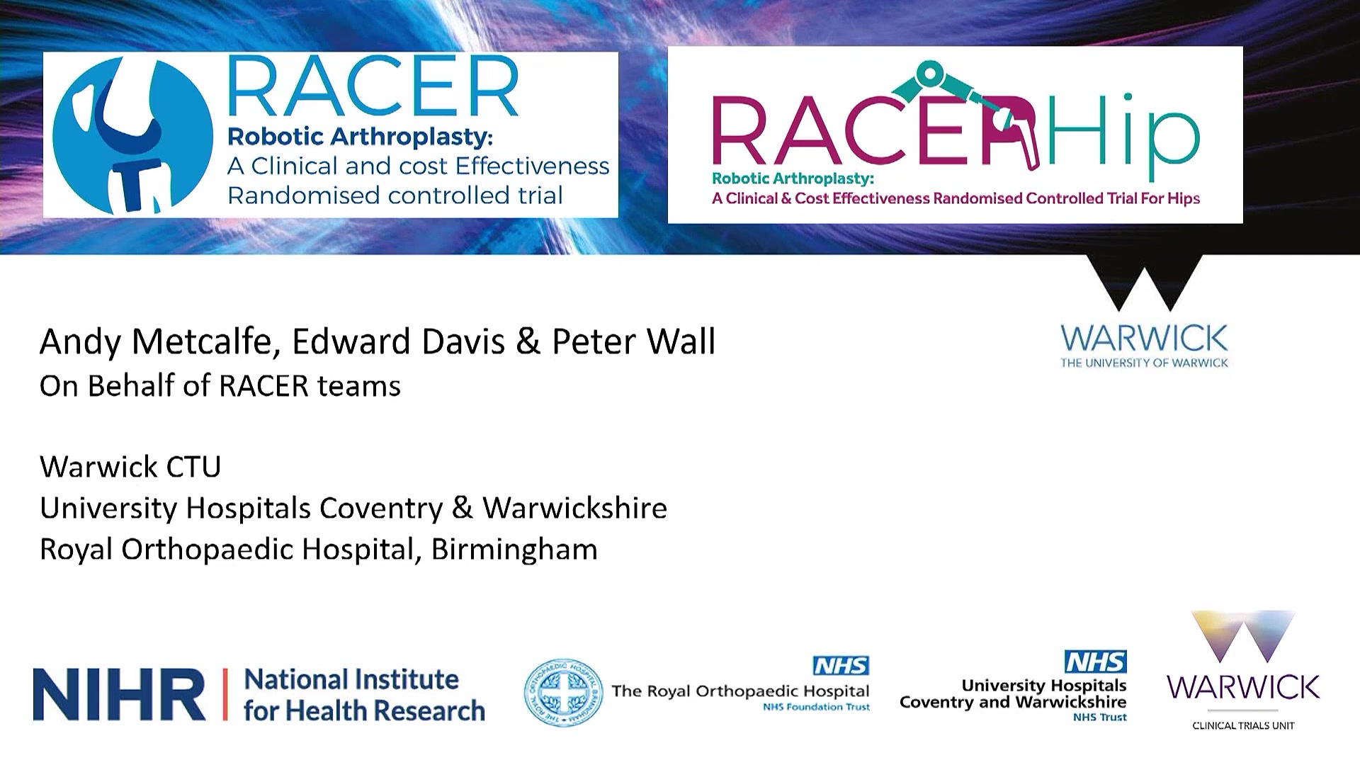 In this presentation by Andy Metcalfe and Fares Hadadd, the duo discusses the RACER (Robotic-assisted Surgery for hip and knee replacement) studies, which are two NIHR-funded randomized controlled trials aimed at comparing robotic-assisted surgery with conventional methods. Starting off with a light-hearted acknowledgment of Ed's absence and the pleasant surprise of having an adequate substitute, Metcalfe outlines the structure and goals of the studies, detailing the enrollment of participants with primary osteoarthritis and the randomized assignment to either robotic or conventional surgery shortly before the procedure.