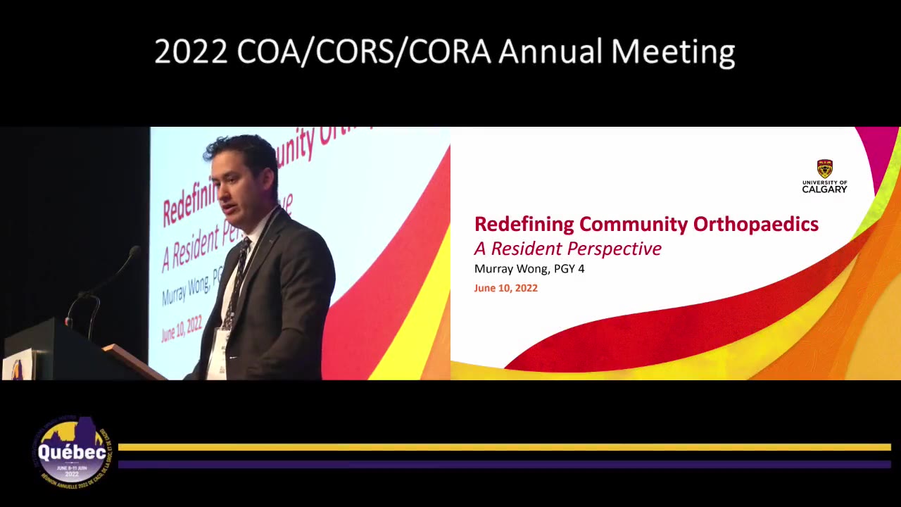 The presentation, led by Dr. Murray Wong, explores the concept of community orthopedics from a resident's perspective, noting the importance of collaboration with colleagues in Calgary. Dr. Wong discusses the various interpretations of community surgery, highlighting themes such as generalist versus subspecialist training, the emphasis on clinical care over research, and the variabilities present in both academic and community settings. He reflects on his own journey, recalling the influence of a community orthopedic surgeon during medical school and discussing the limited exposure to community practice throughout residency.