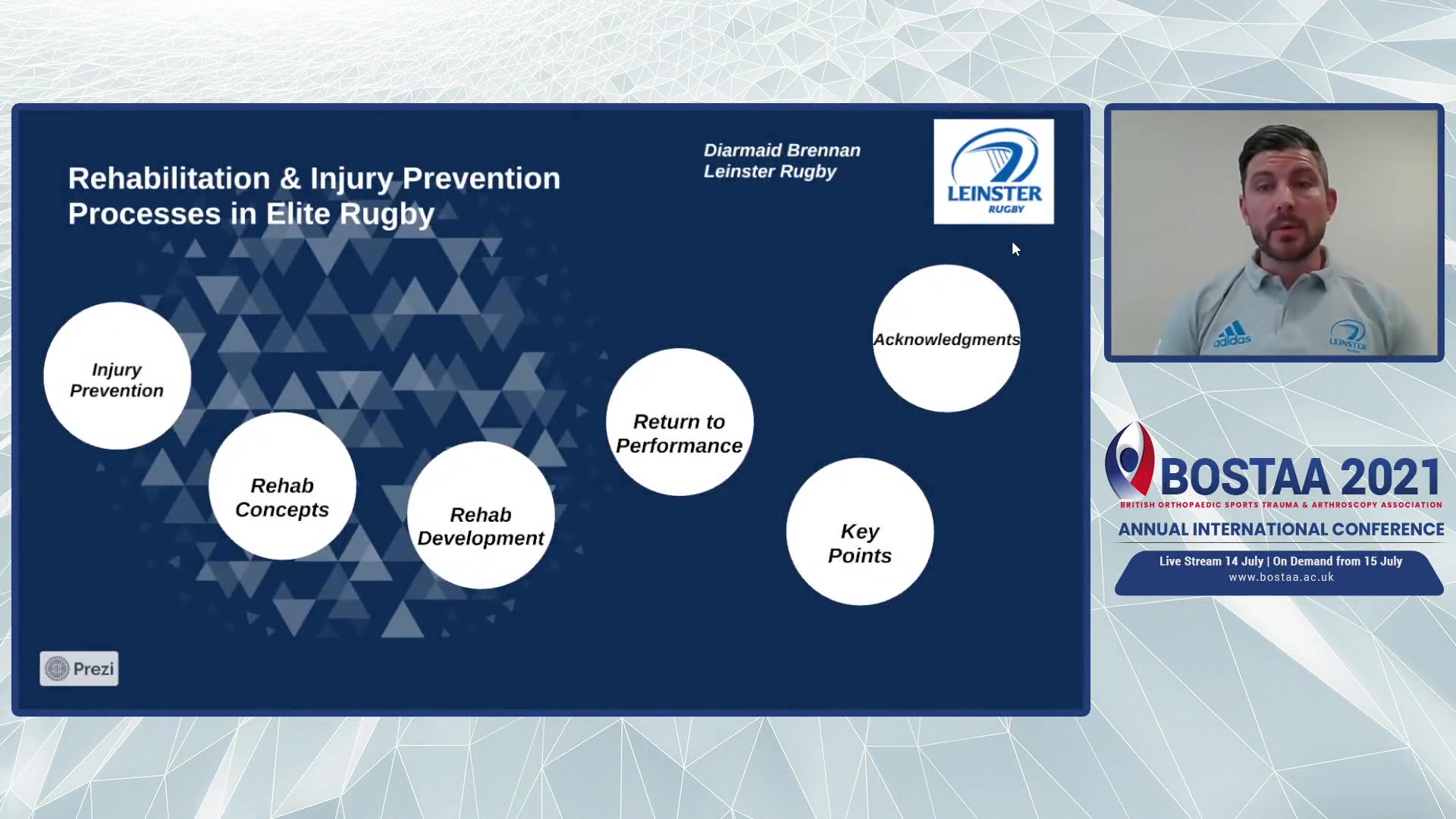 Diarmaid Brennan, the Senior Rehab Coordinator with Leinster Rugby, delivers a comprehensive presentation on the rehabilitation and injury prevention strategies utilized in elite rugby. He begins by emphasizing the importance of prioritizing injury prevention before rehabilitation. Brennan details the systematic approach undertaken by the team, which involves identifying known injury risk factors through literature and in-house data collection, monitoring athletic performance, and addressing potential gaps through targeted injury prevention exercises.