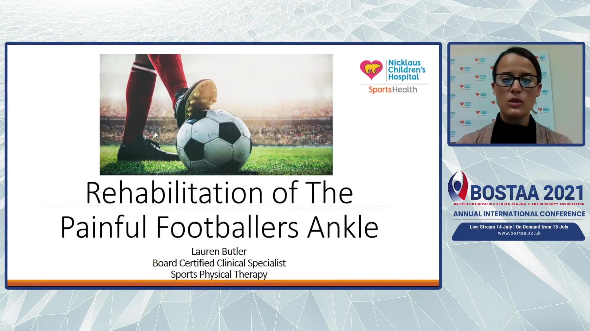 This presentation features Lauren Butler, a Board Certified Clinical Specialist in Sports Physical Therapy from Nicklaus Children's Hospital in Miami, Florida. The focus is on the rehabilitation of painful ankle injuries commonly experienced by football players, particularly concerning ankle sprains which are prevalent among youth soccer players. Butler emphasizes the importance of comprehensive rehabilitation programs to reduce the recurrence of injuries, with statistics suggesting that a significant portion of athletes experience long-term issues following an ankle sprain.