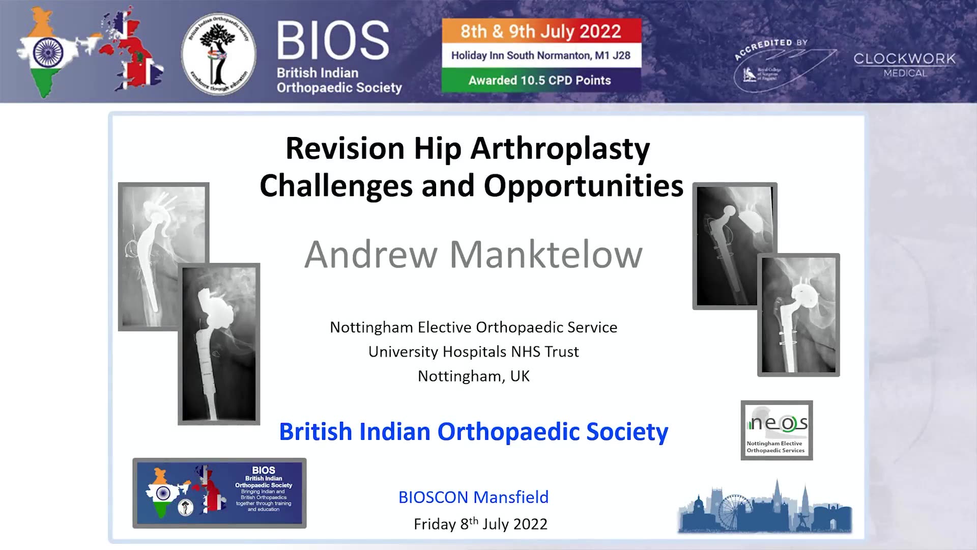 The presentation begins with Andrew Manktelow extending warm greetings to the audience at the British Indian Orthopaedic Society meeting in Mansfield, humorously referencing England's recent cricket successes. He expresses gratitude for the opportunity to discuss the challenges and advancements in revision hip arthroplasty.