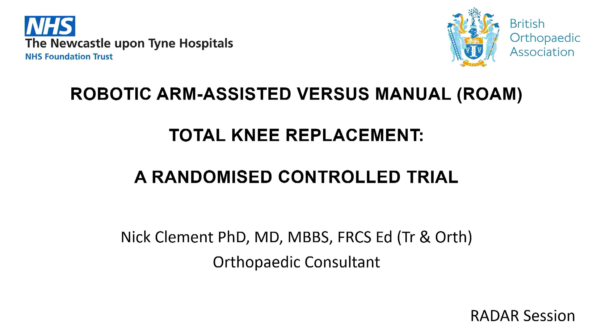 In this presentation, Nick Clement, a surgeon from Edinburgh, introduces the ROAM study at the RADAR group. He acknowledges his team members from Newcastle who contributed to the study and discusses the key objectives, methodology, and results related to robotic knee surgery versus manual knee replacements. The study aimed to evaluate functional outcomes, patient satisfaction, and quality of life, specifically focusing on patients receiving a robotic knee replacement for varus knees.