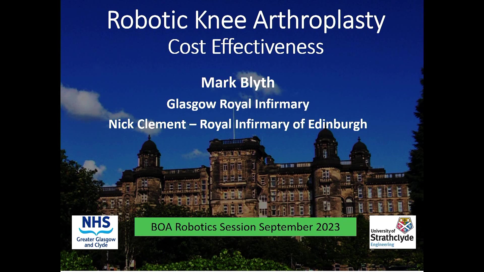 This presentation, led by Mark Blyth, examines the cost-effectiveness of robotic surgery in the context of healthcare financial pressures and clinical outcomes. Blyth acknowledges the contributions of Nick in the preparation, emphasizing the relevance of the topic due to the rising costs associated with new technologies in healthcare, including robotics.