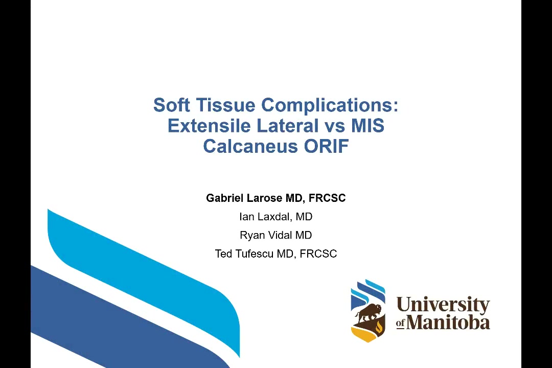 In this presentation, Gabriel Larose discusses the complications associated with soft tissue following two different surgical techniques for calcaneus fractures: the extensile lateral approach and minimally invasive surgery (MIS). He begins by thanking his co-authors and clarifying that there are no significant disclosures related to their work. Larose shares findings from multiple RCTs which indicate that while open reduction and internal fixation (ORIF) shows no short-term benefits, it does lead to improved long-term outcomes. However, it also comes with a higher risk of surgical complications, particularly soft tissue issues, with rates as high as 25% noted with the extensile lateral approach as opposed to lower rates with MIS, though the latter findings come from smaller studies.
