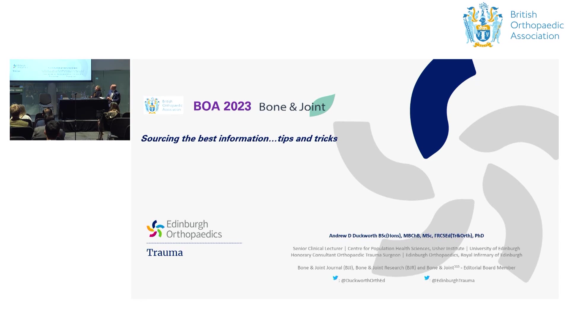 In this presentation by Andrew Duckworth, the focus is on effectively sourcing and utilizing the best information for orthopedic practice through various tools and platforms, particularly those associated with the Bone and Joint Journal. Duckworth begins with an overview of knowledge translation and the use of social media, emphasizing how these tools can be advantageous in keeping up with the latest research in the field. He discusses the importance of platforms like BJ360 and talks about how the explosion of publications in orthopedics can make it difficult to stay updated—hence the necessity for tailored summaries and accessible information.