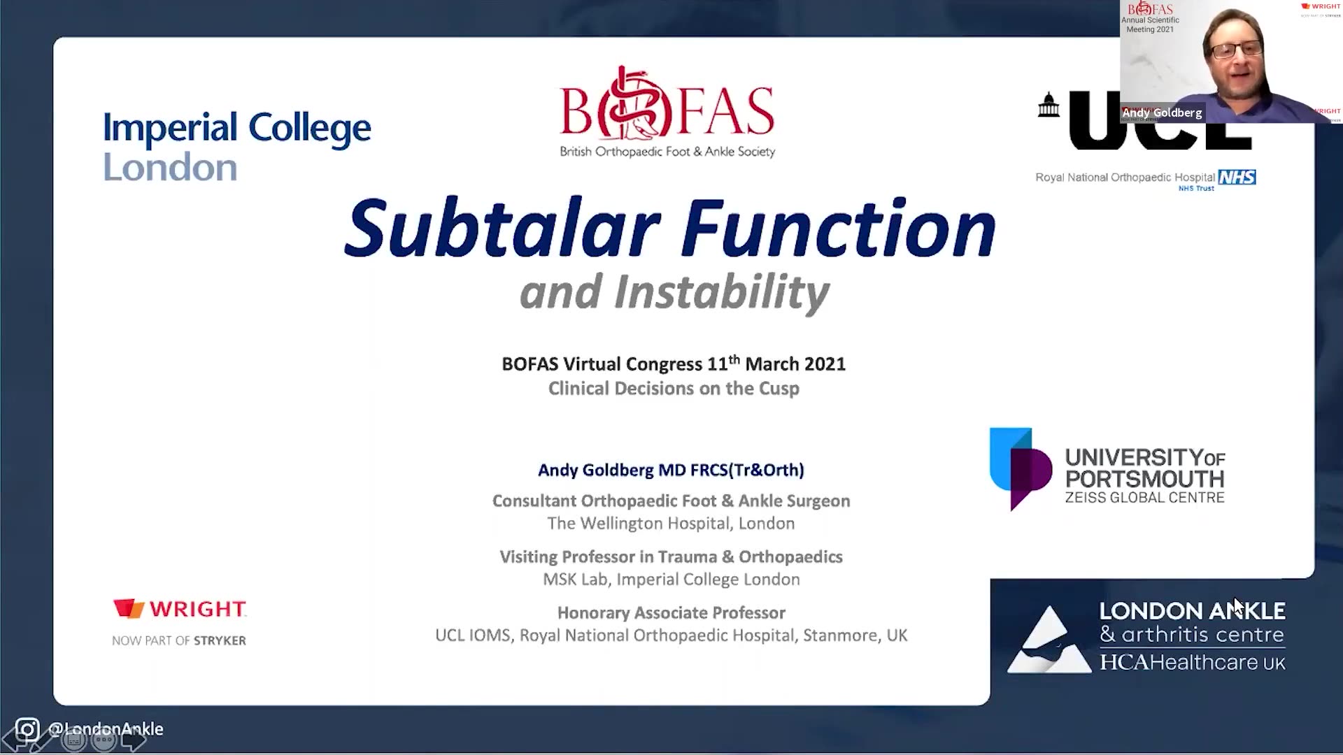This transcript represents a comprehensive presentation given by Andrew Goldberg on the subtalar joint and its functionality within the context of foot stability and mobility, as part of an online medical congress hosted by the British Orthopaedic Foot & Ankle Society (BOFAS). Goldberg discusses the intricacies of the subtalar joint, referring to its functionality, anatomy, and the complexities involved in diagnosing and treating subtalar instability. He highlights the misconception surrounding subtalar movements, arguing that terms like eversion, abduction, and dorsiflexion oversimplify the joint's operational mechanics. He elaborates on a collaborative research study, conducted to determine the center of rotation of the subtalar joint, ultimately claiming that it lies through the middle facet, countering previous notions that it was the lateral facet.