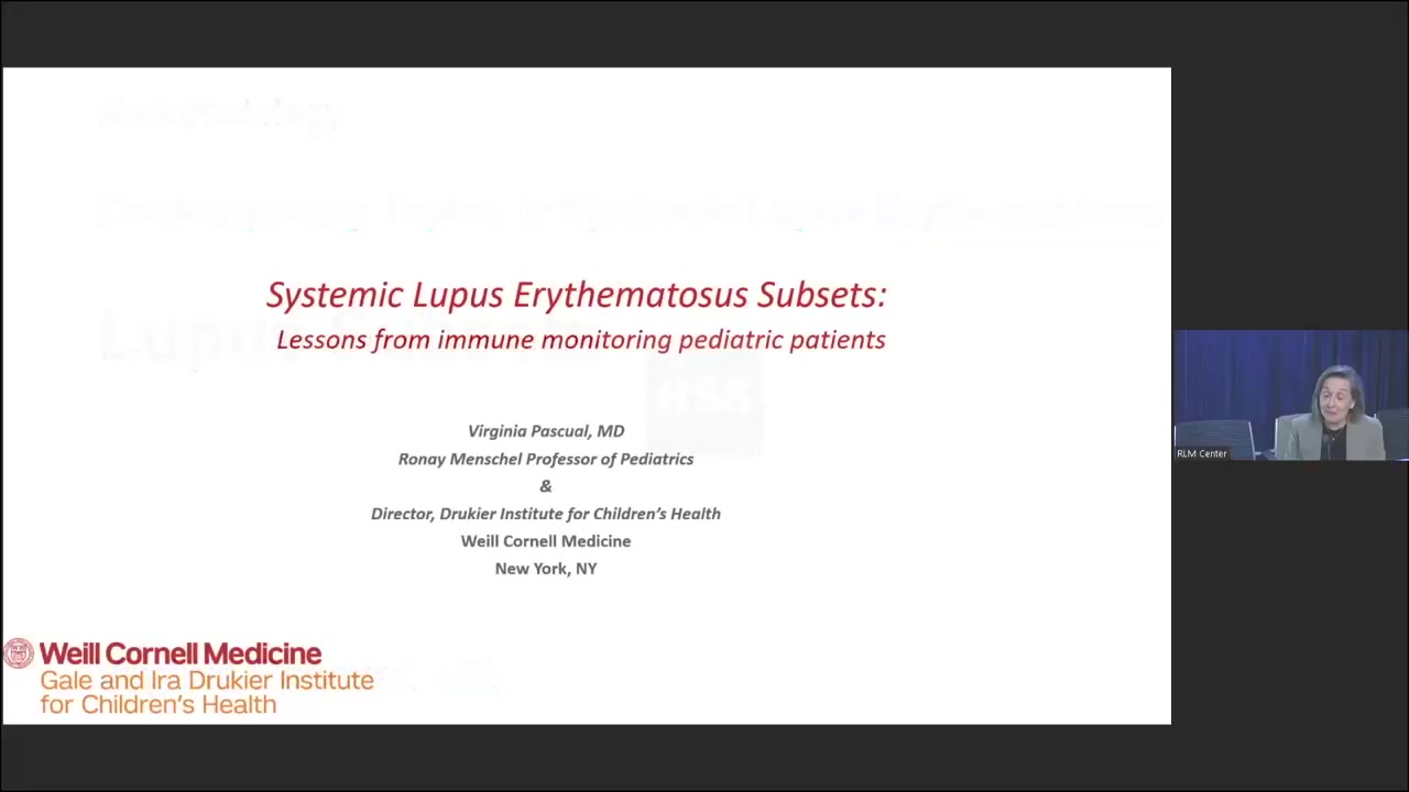 This presentation led by Virginia Pascual focuses on the intricacies of lupus subsets, outlining the need for a nuanced understanding of this autoimmune disease. Pascual acknowledges the contributions of previous speakers, stating that their discussions ease her explanation regarding the rationale for subsetting lupus patients. She aims to discuss historical attempts at classification, particularly utilizing high throughput technologies, and the lessons learned from global efforts to classify lupus patients. Throughout the talk, she traces the scientific journey surrounding the role of interferon in lupus and the fundamental importance of B-cells and plasma cells in the disease's pathology.