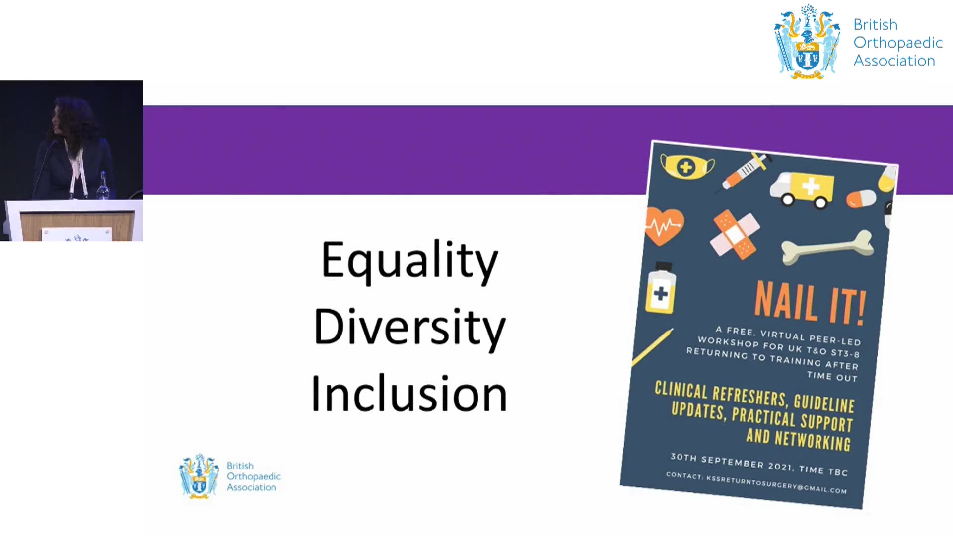 Caroline Hing, following Salma, discusses ongoing efforts by the BOA to improve diversity and inclusion practices, mentioning the launch of various working groups focusing on issues such as LGBTQ+ representation, career sponsorship, and disabled individuals in surgery. Hing underscores the importance of creating a supportive environment for trainees from diverse backgrounds, encouraging their engagement through targeted outreach initiatives.