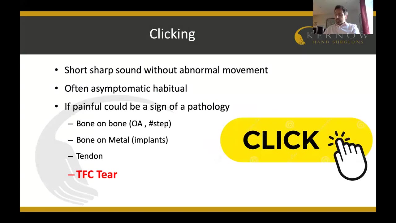 This video transcript features a detailed talk by Anmar Al-Shawi focusing on wrist mechanics, specifically the causes and significance of clicking and clunking sounds in the wrist. Al-Shawi explains that clicking is a common occurrence often linked to specific movements, which may or may not cause pain. He delves into the triangular fibrocartilage (TFC), drawing parallels between TFC tears and meniscus injuries, emphasizing that they can be traumatic in younger individuals or degenerative in older ones. Diagnosis involves a combination of clinical history, examination, and imaging techniques, including MRI and wrist arthroscopy to confirm the presence of tears and assess joint condition.