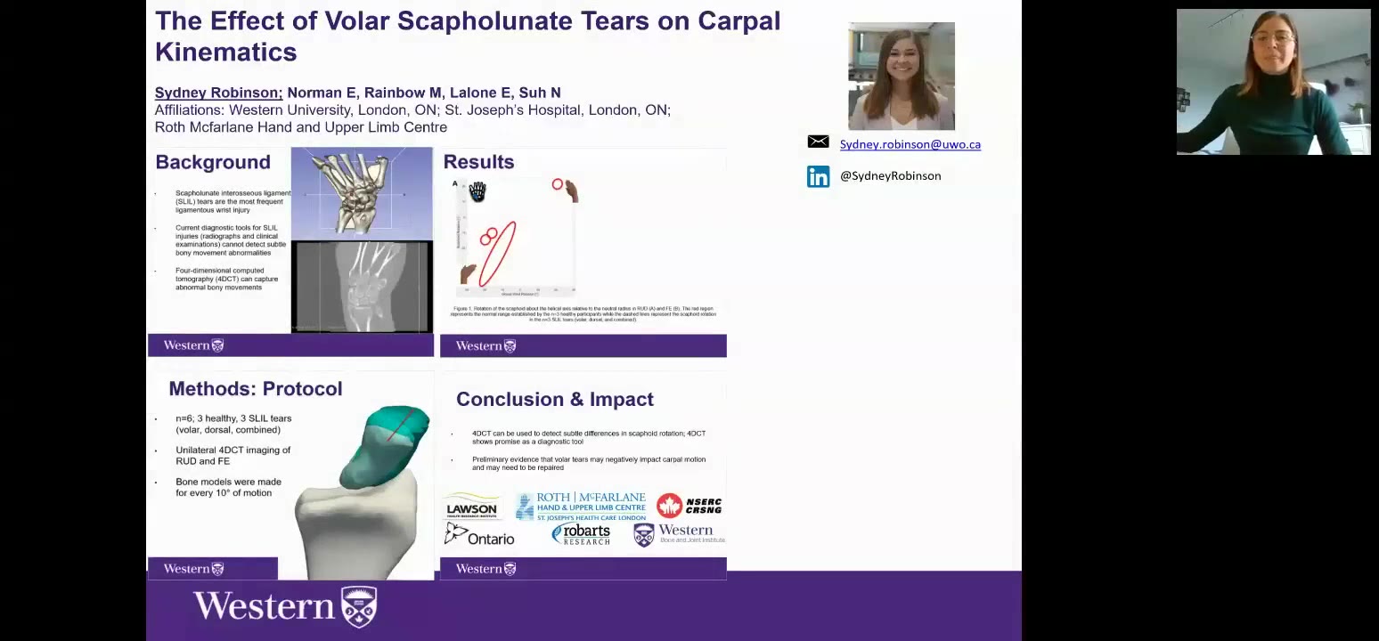 The findings reveal distinct patterns of abnormal scaphoid rotation associated with different types of SLIL tears, particularly noting that volar tears exhibit notable deviations. In conclusion, Robinson emphasizes that 4DCT proves to be a promising diagnostic tool for detecting subtle rotational differences indicative of SLIL tears, suggesting that volar tears may require surgical intervention due to their potential to disrupt normal carpal motion.