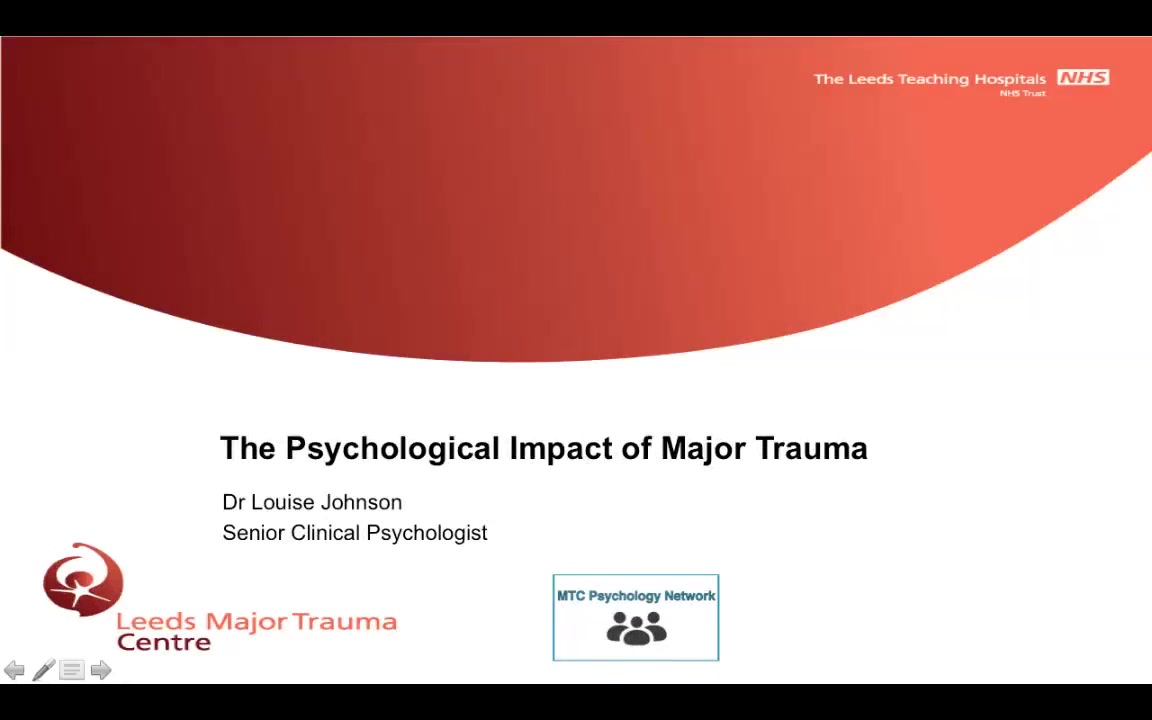 The presentation begins with Dr. Louise Johnson, a clinical psychologist from Leeds Major Trauma Center, introducing herself and outlining the focus of her talk on the psychological impacts of major trauma. She emphasizes that the psychological footprint of trauma can last significantly longer than the physical injuries that result from such events. Dr. Johnson discusses three main aspects that influence outcomes following major trauma: mental health, physical health, and social health. She highlights common psychological difficulties faced by patients, such as depression, anxiety, post-traumatic stress disorder (PTSD), and adjustment issues. Social support is also presented as a crucial factor in recovery.