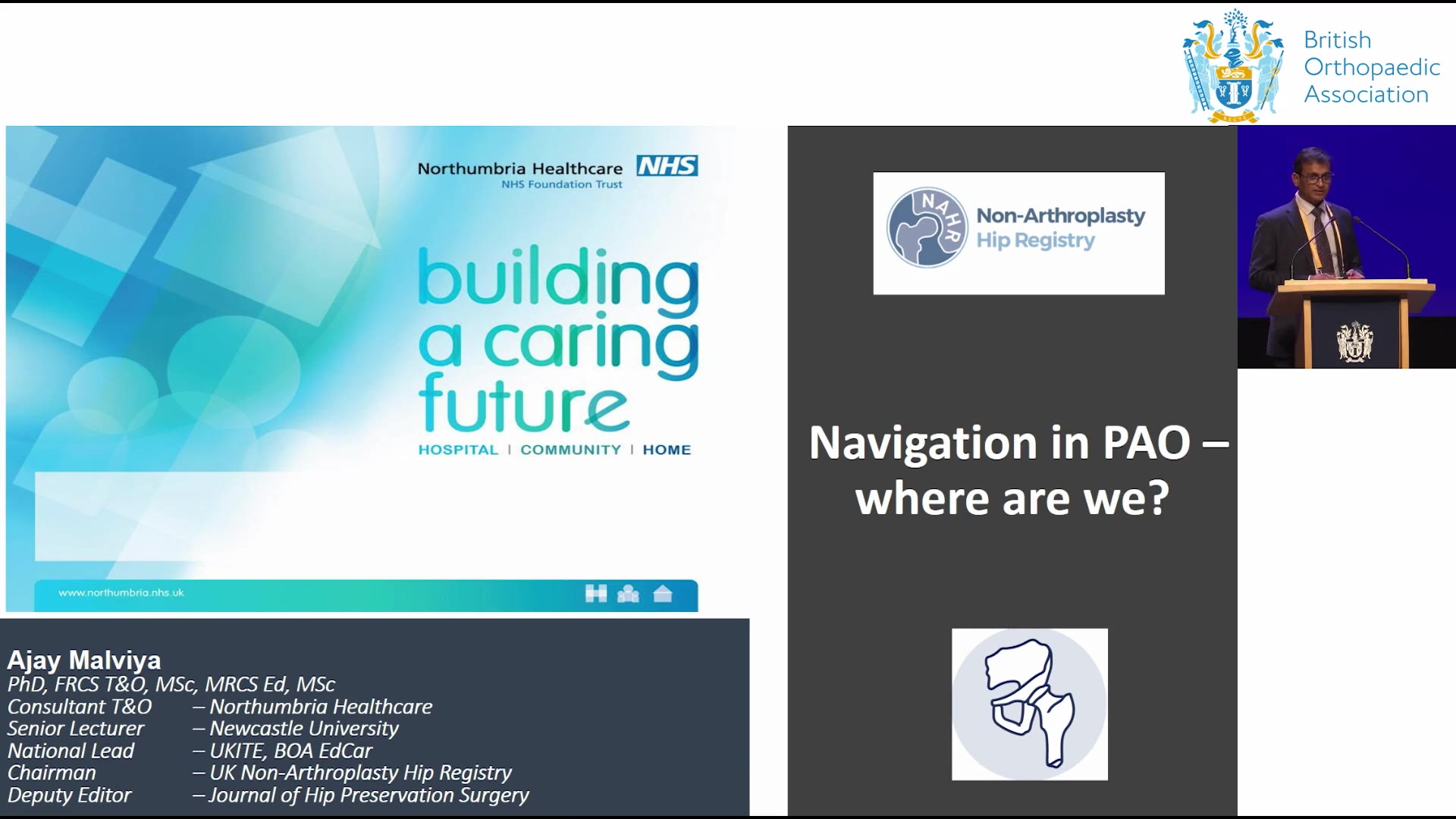 The speaker, Ajay Malviya, discusses advancements in navigation techniques for periacetabular osteotomy (PAO) for hip dysplasia in his presentation. He begins by highlighting the significance of the Non-Arthroplasty Hip Registry, celebrating its 10th anniversary and acknowledging its contributions to hip preservation. The complexity of PAO is addressed, particularly the challenges associated with anatomical accuracy and complication rates. Malviya emphasizes the need for precise acetabular orientation during surgery, noting that current methods rely heavily on two-dimensional imaging, which can introduce errors in a three-dimensional procedure. He references a study from a high-volume surgical center regarding the precision of various angles measured during PAO, revealing a margin of error that raises concerns about the surgical outcome.