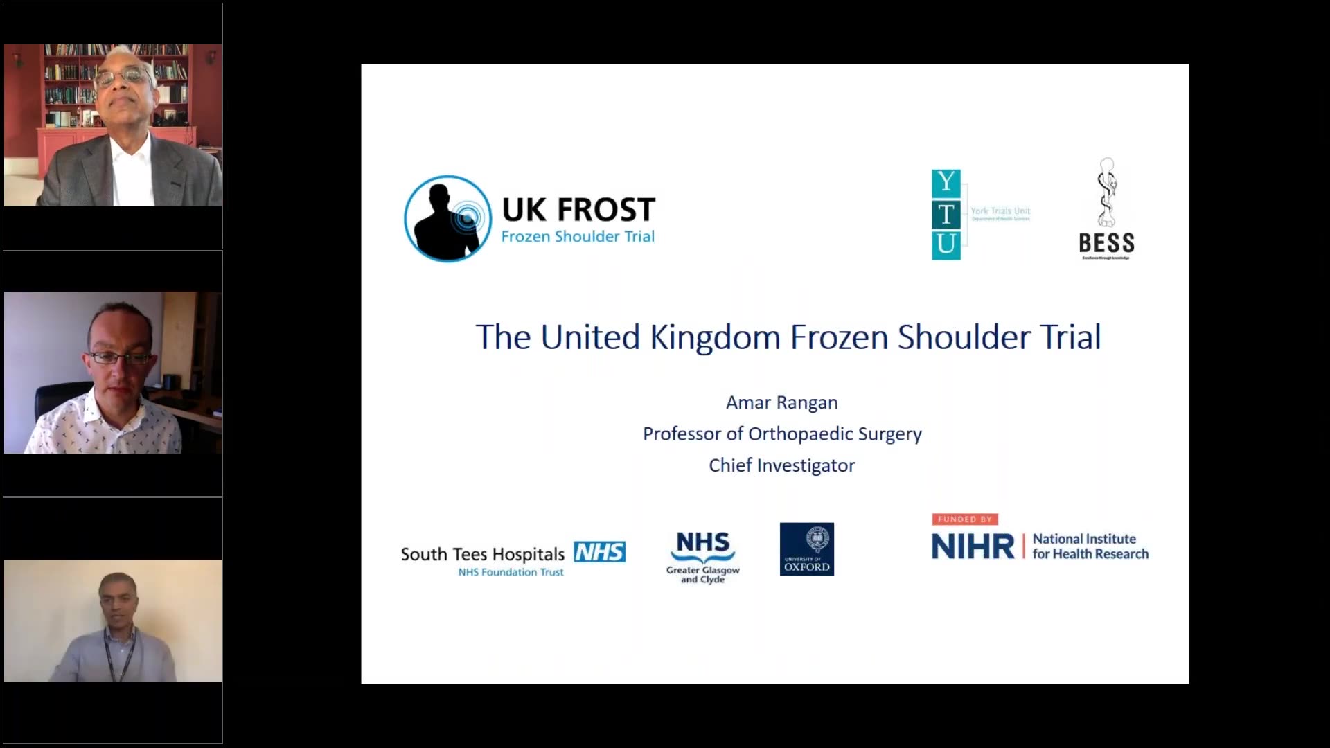 In this informative presentation, Dan Perry introduces Amar Rangan, a professor at York, to discuss the UK FROST trial, which focuses on frozen shoulder treatments. Amar stresses the trial's secrecy prior to its publication, reminding attendees not to share any presentation details until the findings are officially released on October 2nd and in print on October 3rd.