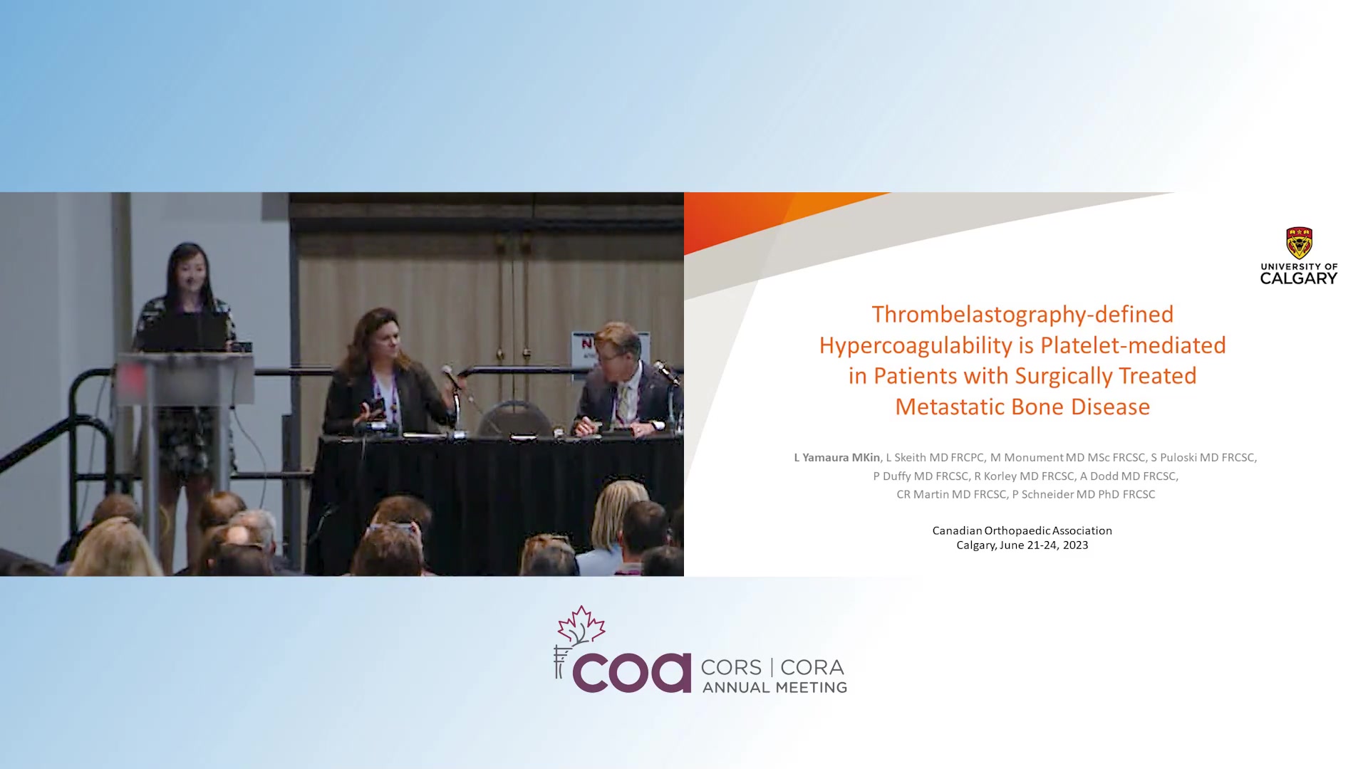 In this presentation, Lisa Yamauura discusses a study focusing on metastatic bone disease (MBD) and its associated risks following orthopedic surgery. MBD occurs when cancer spreads to bone, significantly increasing the chances for complications like venous thromboembolism (VTE). The overall VTE rate observed after such surgeries is notably high among patients with metastatic bone disease, in comparison to those without cancer. The research highlights the importance of understanding clotting mechanisms and the role of platelets in VTE risk, emphasizing the need for better thromboprophylaxis guidelines specifically tailored to this high-risk group.