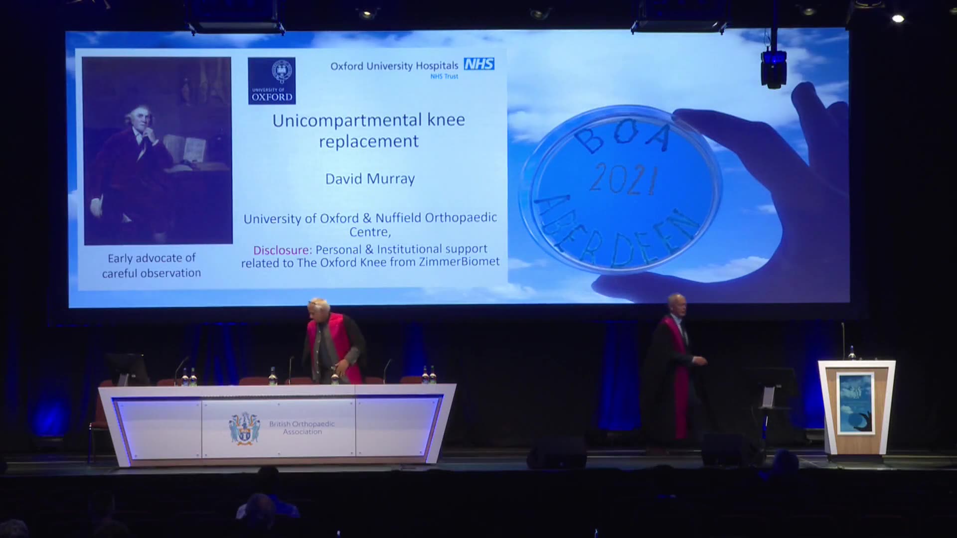 The video presentation by David Murray discusses the topic of unicompartmental knee replacement, reflecting on both its historical context and its current clinical application. Murray opens by thanking the audience and acknowledges his gratitude toward John Hunter, a pivotal figure in the field of orthopedics. He explains his personal journey in bioengineering and his unexpected transition to working with the Oxford knee, which was developed by John Goodfellow and John O'Connor