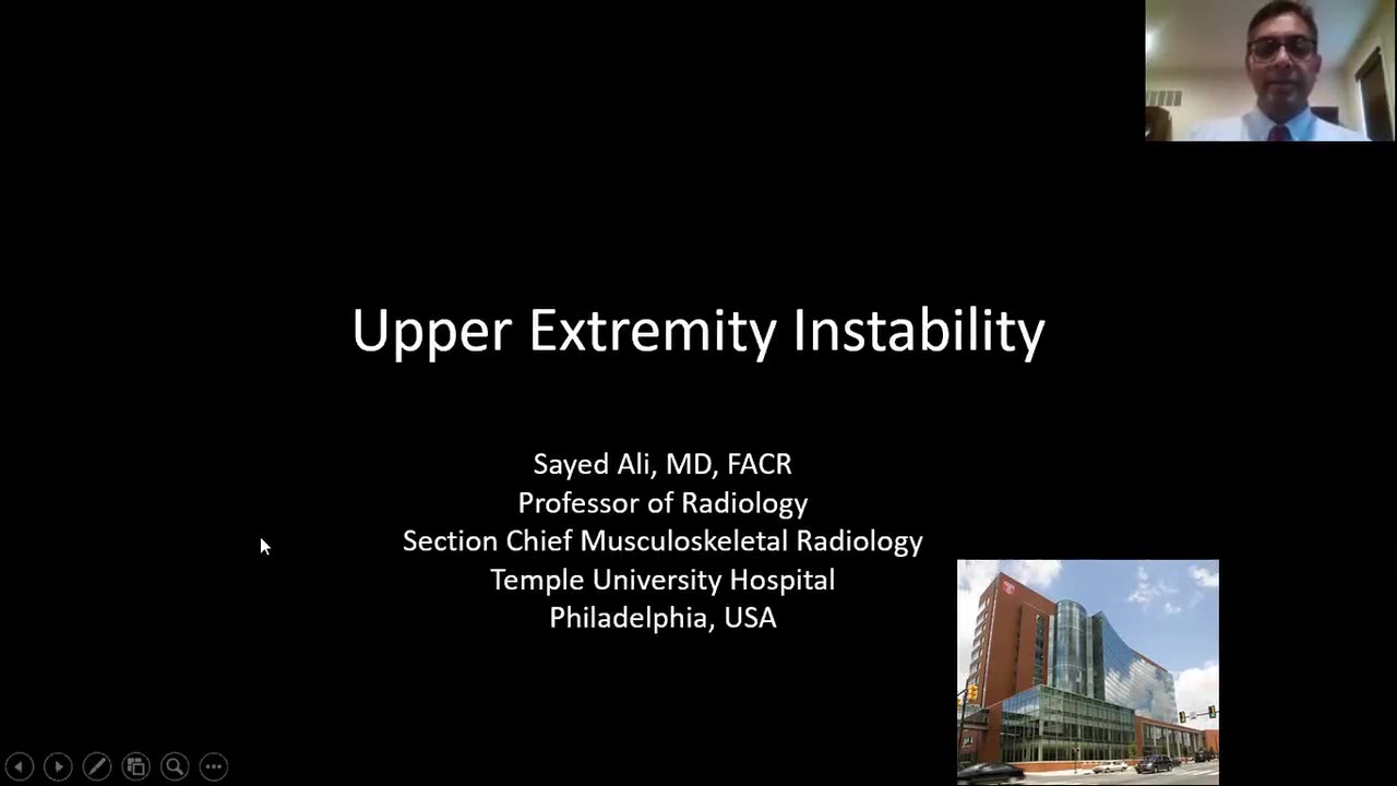 In this presentation, Dr. Sayed Ali, a radiologist at Temple University in Philadelphia, discusses upper extremity instability, focusing specifically on shoulder and carpal instability as related to sports injuries. He begins by detailing the types of shoulder dislocations, noting that 95-99% are anterior dislocations, typically resulting from falls on outstretched hands (FOOSH injuries). He also mentions the less common posterior dislocations and the extremely rare inferior dislocation. Dr. Ali explains the mechanics and imaging challenges in assessing these injuries, emphasizing the use of different imaging views like the Velpeau view to better visualize dislocations and associated osseous injuries such as Hill-Sachs deformities and bony Bankhart lesions.