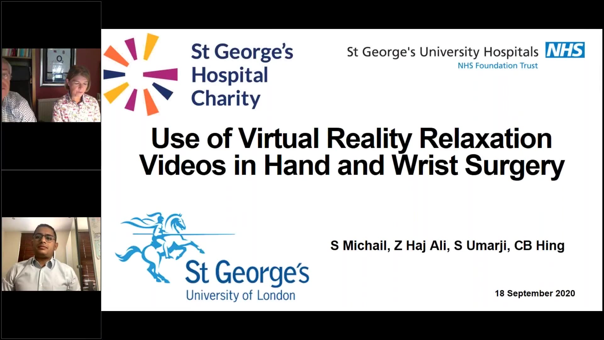 This presentation discusses a project on the use of virtual reality (VR) relaxation videos in hand and wrist surgeries performed while patients are wide awake. It begins with Samuel Michail, a final-year medical student, explaining the stressful reality of surgery for patients and the growing need for non-pharmacological methods to alleviate anxiety, particularly during procedures that do not involve general anesthesia. The introduction of VR as a potential method of relaxation is explored, referencing studies where VR has been effectively used in other medical scenarios.