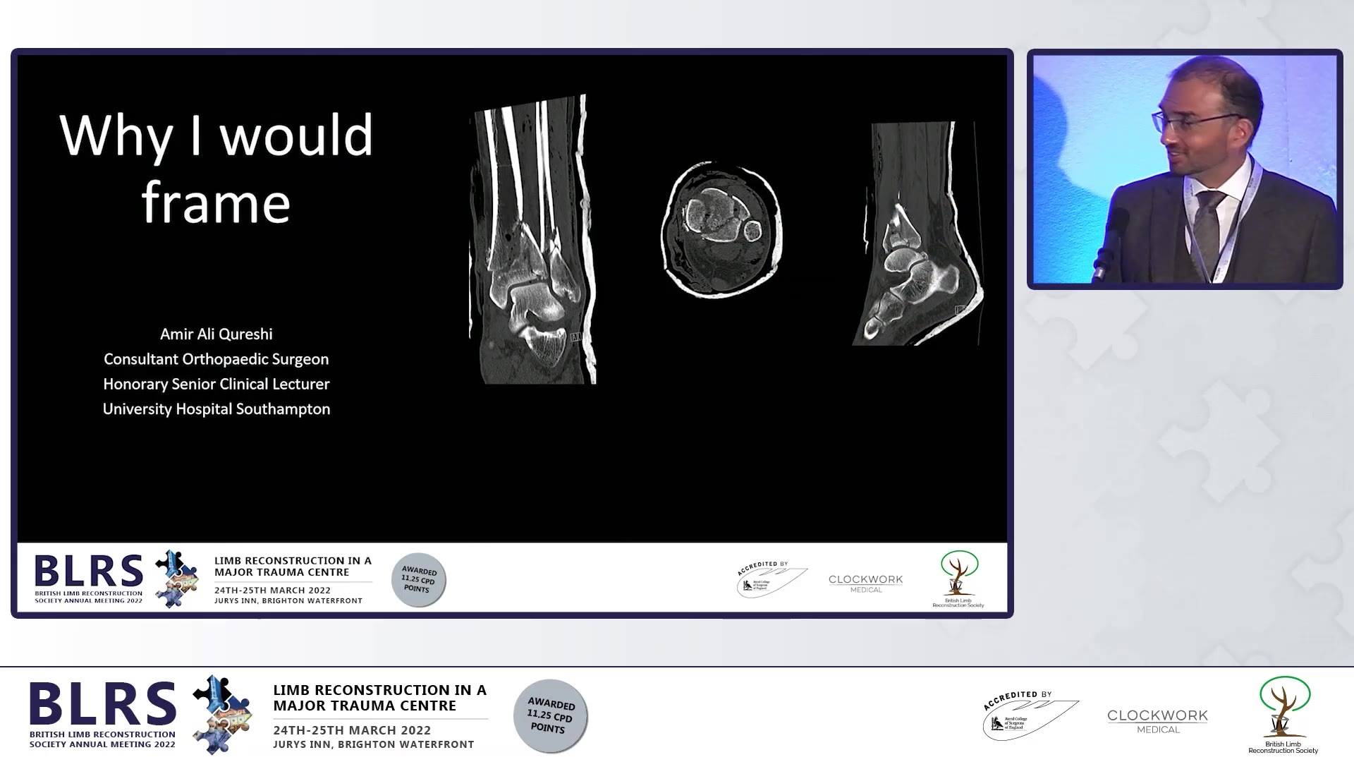 In this presentation, Amir Qureshi shares his experiences and insights on limb reconstruction, specifically focusing on the use of framing in surgical procedures. He expresses gratitude to his colleagues for organizing the meeting and immediately establishes his agreement with fellow speaker Alex regarding the importance of thoughtful practice in surgery.