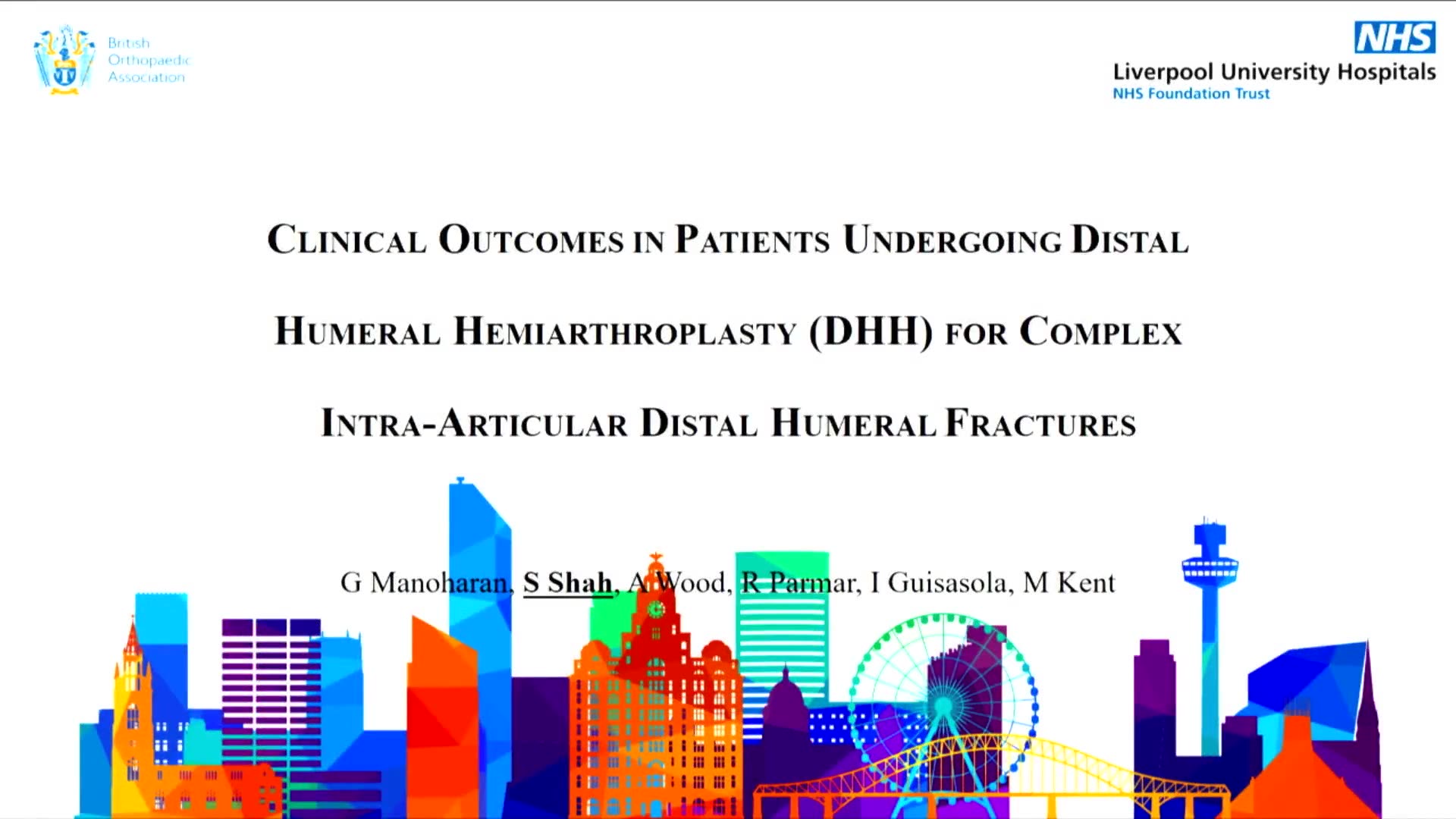 This presentation, led by Sohan Shah, an orthopedic registrar at a Liverpool upper limb unit, discusses the outcomes of distal humeral hemiarthroplasties (DHH) in patients with complex distal humeral fractures. Sohan begins by outlining the prevalence of distal humeral fractures, highlighting treatment options including fixation, total elbow arthroplasty, and the focus of their study, hemiarthroplasty.