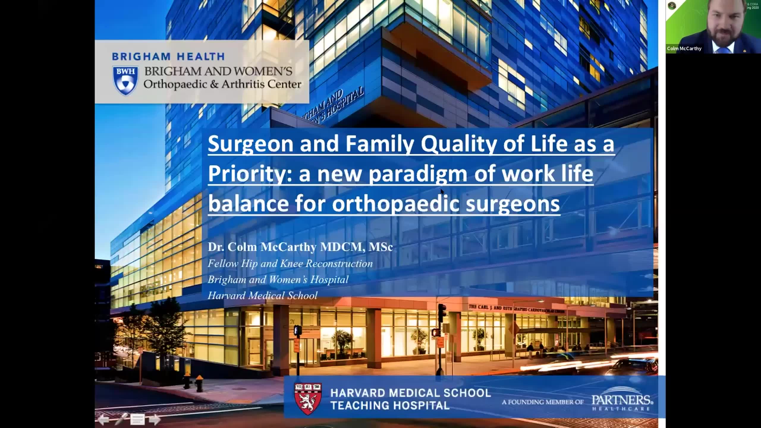 This is a transcript of a presentation by Dr. Colm McCarthy, a fellow at Brigham Women's Hospital associated with Harvard University. Dr. McCarthy introduces himself and addresses financial and personal disclosures, emphasizing his privilege as a cis heterosexual white male in a medical landscape. He discusses the issue of burnout in medical professionals, citing alarming statistics, especially among female surgeons, and the importance of normalizing discussions around mental health and seeking help.