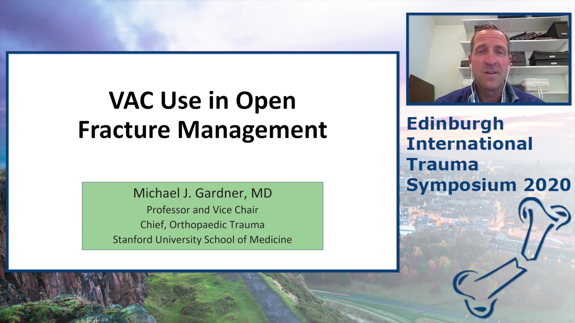 The presentation features Michael Gardner from Stanford University discussing the application of Negative Pressure Wound Therapy (NPWT) in managing open fractures, particularly focusing on severe open tibia fractures resulting from accidents like motorcycle crashes. Gardner outlines a clinical scenario involving a young patient with a complicated injury requiring urgent debridement and stabilization. He explains the theoretical mechanisms behind NPWT, how it aids wound healing by removing interstitial fluid and promoting granulation tissue, and addresses its limitations.