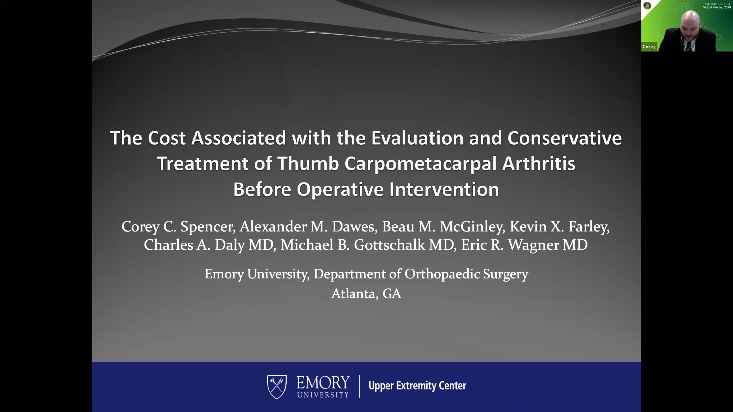 In this presentation, Corey Spencer introduces a research study focused on the costs associated with the evaluation and conservative treatment of thumb carpometacarpal (CMC) arthritis before surgical intervention. He highlights the variability in diagnostic and treatment approaches among surgeons, leading to diverse utilization of tests and treatments. The study analyzed data from the Truven Marketscan insurance database between 2010 and 2016, involving 44,640 patients, and found that the total preoperative cost over one year was approximately $24.6 million, averaging around $551.71 per patient. Office visits were identified as the highest contributor to costs at 45%, followed by injections and other treatments. Despite clinical evidence supporting steroid injections, the uptake was low, with only 49% of patients receiving them. The findings suggest older patients receive less aggressive treatment, which contrasts with current literature, indicating potential benefits from extended conservative care. This research aims to inform healthcare providers about cost-effective measures in treating thumb arthritis.
