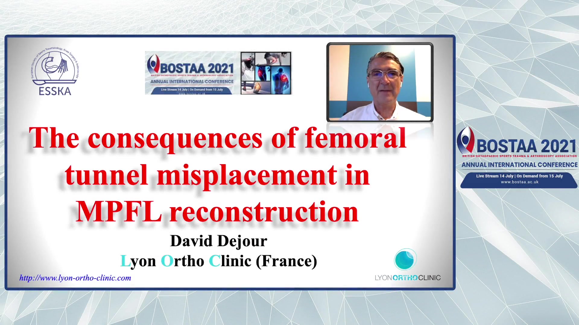 The presentation, led by David Dejour at BOSTAA 2021, focuses on the implications of femoral tunnel misplacement in MPFL (Medial Patellofemoral Ligament) reconstruction. Dejour emphasizes that improper placement can lead to failure of the procedure, characterized by pain, stiffness, instability, and potential re-dislocation of the patella. He discusses the importance of technique, particularly on the femoral side, where misalignment can significantly impact outcomes. Key pointers include the necessity of using fluoroscopy for accurate positioning and the effects of over-tensioning or under-tensioning the graft on recovery.