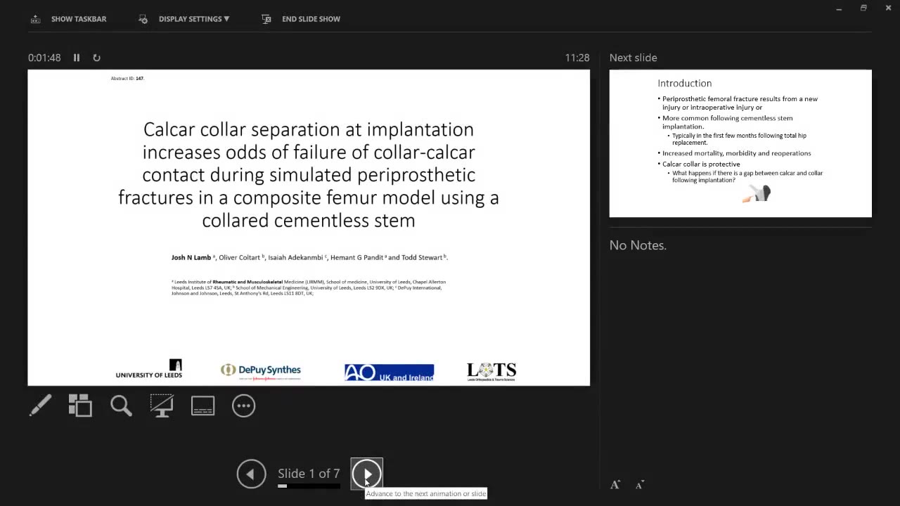 In this presentation, Josh Lamb from the University of Leeds discusses the implications of periprosthetic fractures of the femur, particularly following total hip replacement surgeries that utilize cementless stems. He clarifies the understanding that periprosthetic fractures are more likely to occur immediately after surgery and are linked to increased rates of mortality and reoperations, although they remain relatively uncommon. New research highlights that using a collared stem as opposed to a collarless cementless stem can significantly lower the incidence of these fractures due to a better prevention of movement between the stem and femur.