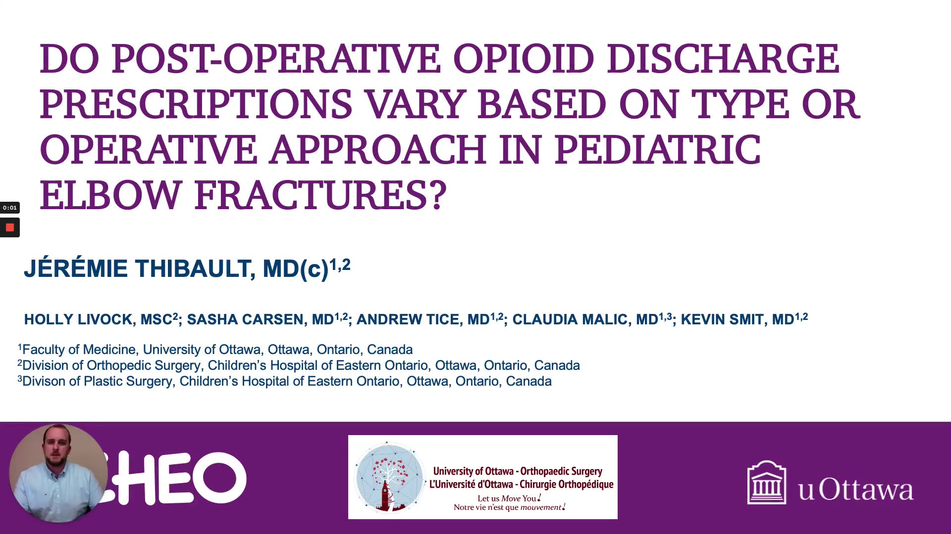 The video features Jeremie Thibault, a third-year medical student at the University of Ottawa, presenting a research study titled "Do Post-Operative Opioid Discharge Prescriptions Vary Based on Type or Operative Approach in Pediatric Elbow Fractures?" The aim of the study is to evaluate the prescribing habits of opioid medications among residents and staff surgeons following surgical management of pediatric elbow fractures, highlighting the importance of understanding the variations in post-operative care. Jeremie discusses the commonality of elbow fractures in children, the potential side effects of opioids, and the impact of over-prescription on the ongoing opioid crisis.